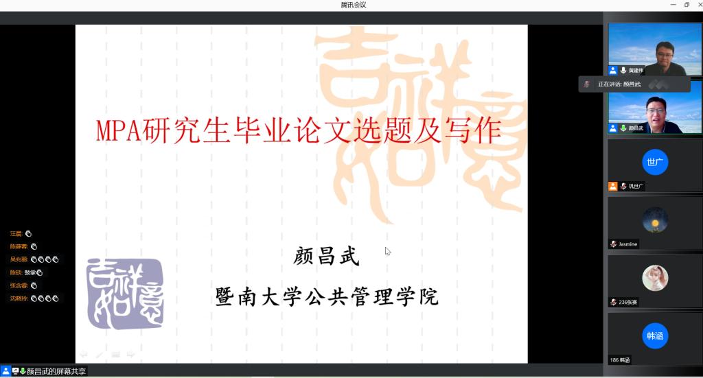 20211031日下午,应黑丝 邀请,暨南大学黑丝 博士生导师、中国行政管理学会理事颜昌武教授为黑丝 师生开展了题为《MPA研究生毕业论文选题及写作》的线上讲座。黑丝 副院长(主持工作)、MPA教育中心主任黄建伟教授主持讲座,黑丝 部分教师以及MPA研究生、部分学术型研究生聆听了讲座。