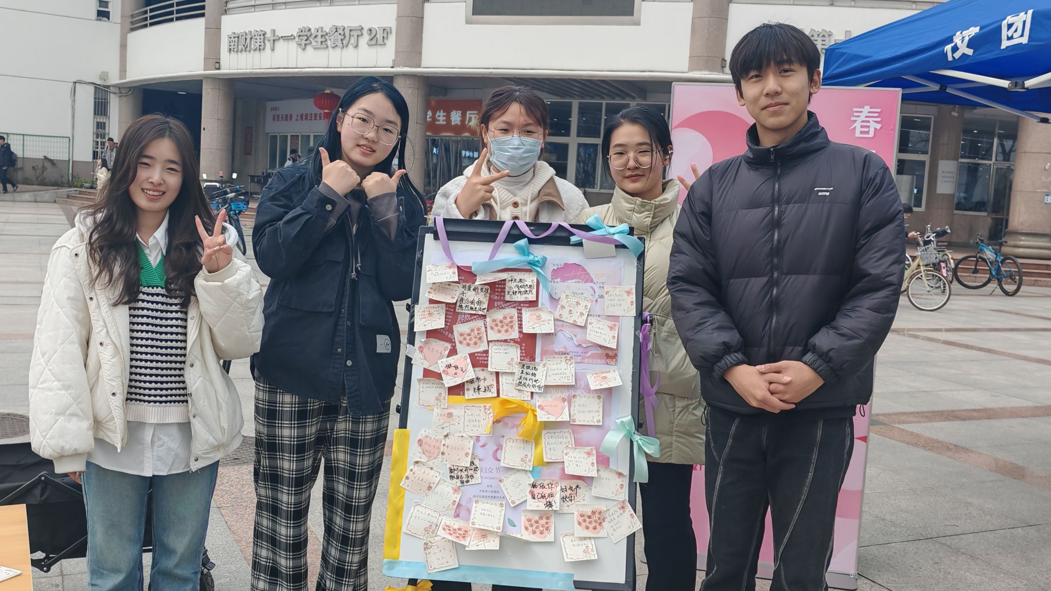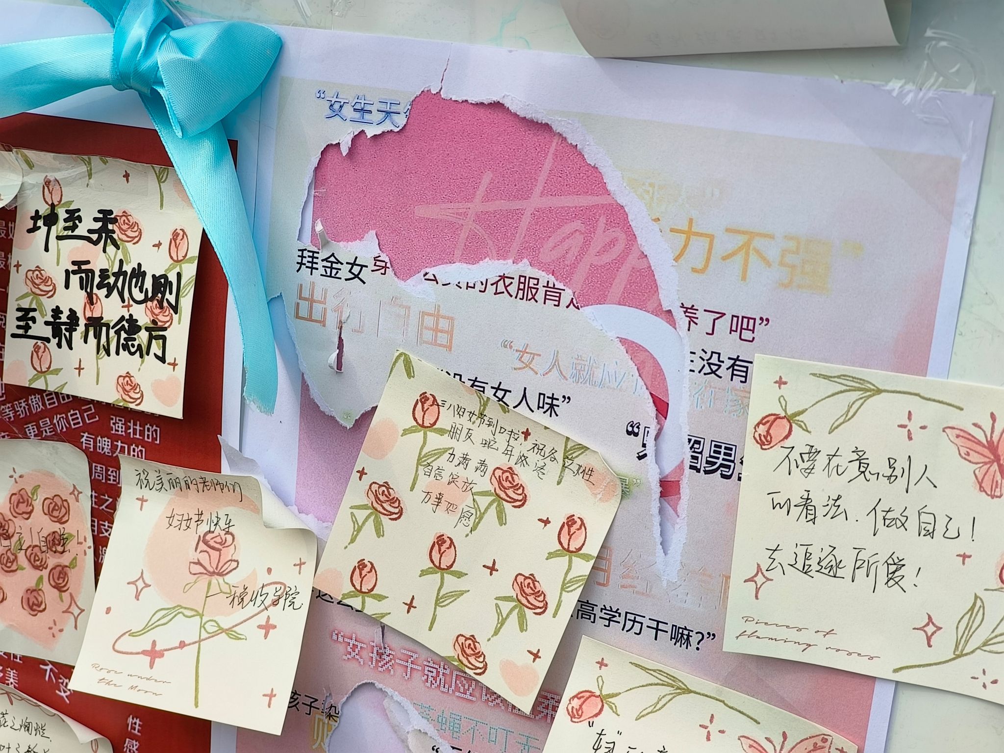 在中苑食堂门口搭建起一方治愈空间,来往的师生在展板上留下了温情的对话。展板上贴满了海报,海报上充斥着来自四面八方的声音:“情绪化”“家庭主妇”“必须温柔”……这些贴在女性身上的刻板标签,被一张张撕下。取而代之的,是五彩斑斓的祝福与礼赞,师生们驻足提笔,写下了对女性的肯定和期许:”你们勇敢且坚定”、“祝她铮铮,祝她昂扬”、“希望每一位女性健康快乐,成为任何想成为的人”……标签不该定义女性,彩色的便利贴如蝶翼栖满墙面,每一句留言都是对偏见的打破,对多元价值的拥抱。