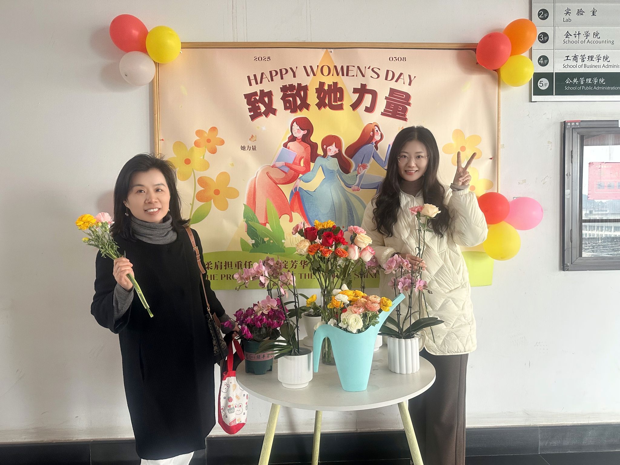 同一时间,在德济楼5楼的电梯口,“她力量·春日鲜花自选站”正氤氲芬芳,康乃馨、玫瑰、蝴蝶兰簇拥成团,满屋飘香。老师们惊喜地取下鲜花,在海报前欢喜留影,海报上的“柔肩担重任,巾帼绽芳华”与她们的笑容交相辉映。“这束花不仅是一份礼物,更是一份看见。”一位青年教师捧着鲜花说道。我们用鲜花与祝福,传递对女性价值的珍视。