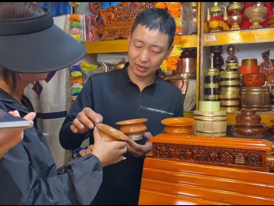 60岁的手艺人央金阿姨经营“西藏传统木碗专营店”已有将近30岁。她表示现如今尝试用电动工具制作木碗粗坯,却被老一辈匠人批评“丢了规矩”。“纯手工做一个碗要三天,用电动工具能省一半时间,但核心的制作工序制作人员从没敢偷懒。”她向团队展示了店铺最珍贵的咂雅(Dza-ba-shing),砸雅是木碗中的上品,产于藏南地区。木材具有解毒功能,且纹路细致,如果变形或塌陷会自动复原。因此砸雅本身的价位就是上千元的,本店最贵的是三千多。她还说碗底和碗口镶了银,卖的也比较贵。如果原本的藏木碗制作用的木材比较好,那么镶了银的木碗也就能卖到三千多。这些价格昂贵的木碗虽然作用极大,但一年也就五六个人购买,甚至有的游客不理解一个木碗的如此昂贵。