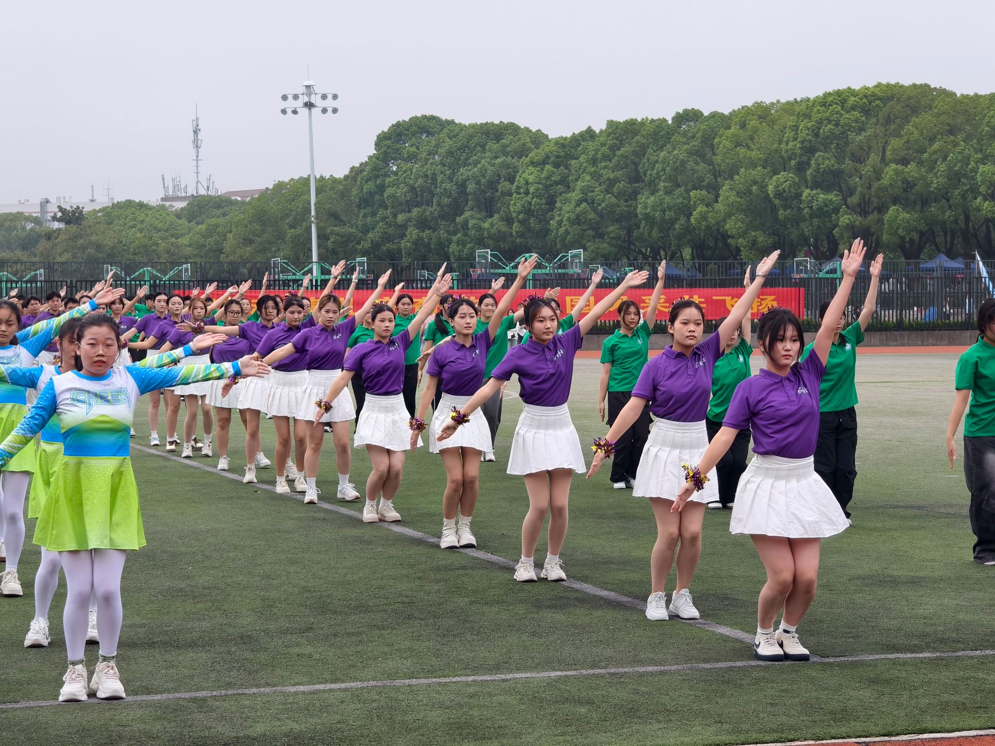 广播操队伍身着紫色的公管院院服和纯净的白色下装,尽显青春活力。飞扬的裙摆,有力的伸展,他们整齐划一的身影,是赛场上跃动的诗行。同时,黑丝