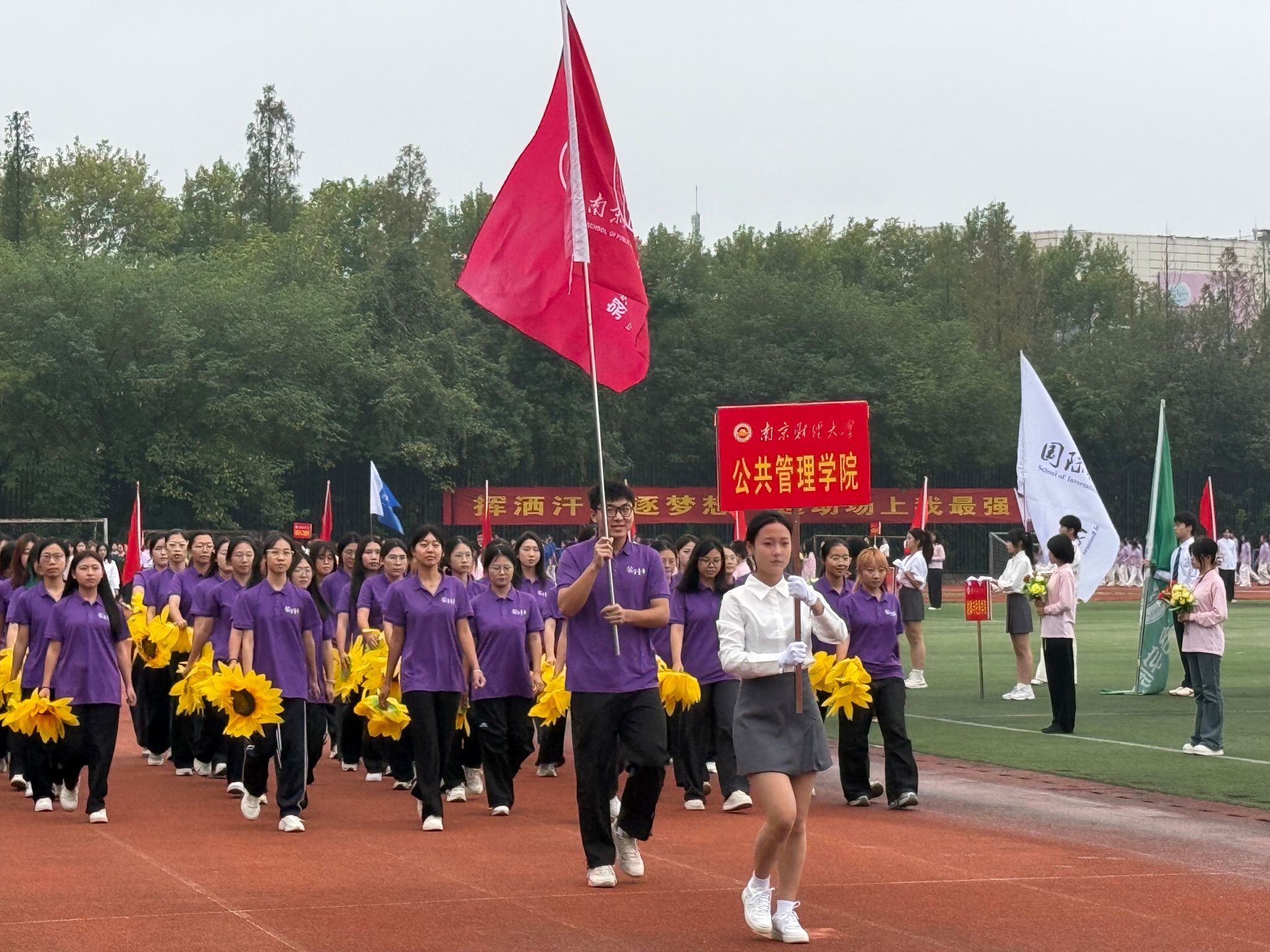明艳的紫色是赛场上流动的风采,铿锵的步伐是公管人靓丽的青春。此次运动会中,黑丝