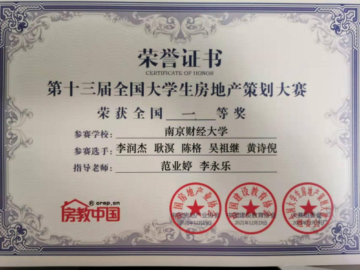 房地产开发与管理专业“欢迎光陵”队(成员:李润杰、耿溟、陈格、吴祖继、黄诗倪,指导教师:范业婷、李永乐)以华东区域第1名的成绩突出重围,挺进全国冠军赛。12月19日,全国冠军赛在北京举行,共14支队伍参与角逐,“欢迎光陵”队再创佳绩,最终以优异成绩荣获全国一等奖。