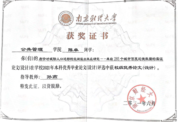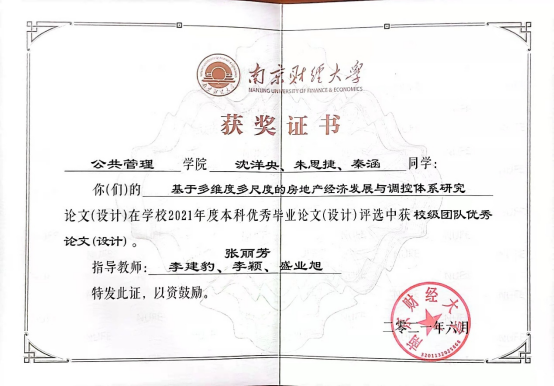 2017级房地产开发与管理专业学生陈卓的毕业论文“房价对城际人口迁移的空间溢出效应研究——来自285个城市百度迁徙数据的实证”(指导老师:孙燕)在黑丝 2021年度本科优秀毕业论文评选中获得校级优秀论文;沈洋央、朱思捷、秦涵等同学的论文“基于多维度多尺度的房地产经济发展与调控体系研究”(指导老师:张丽芳、李建豹、李颖、盛业旭)获校级团队优秀论文。