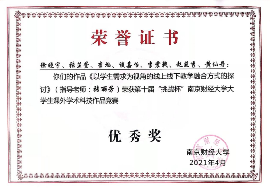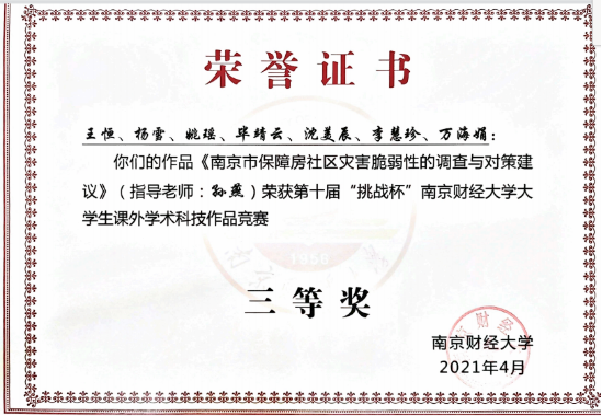 房地产专业王恒小组、徐晓宇小组同学的作品“南京市保障房社区灾害脆弱性的调查性与对策建议”以及“以学生需求为视角的线上线下教学融合方式的探讨”两个作品分别荣获十届“挑战杯”黑丝 大学生课外学术科技作品竞赛的三等奖和优秀奖。指导老师分别为孙燕、张丽芳。