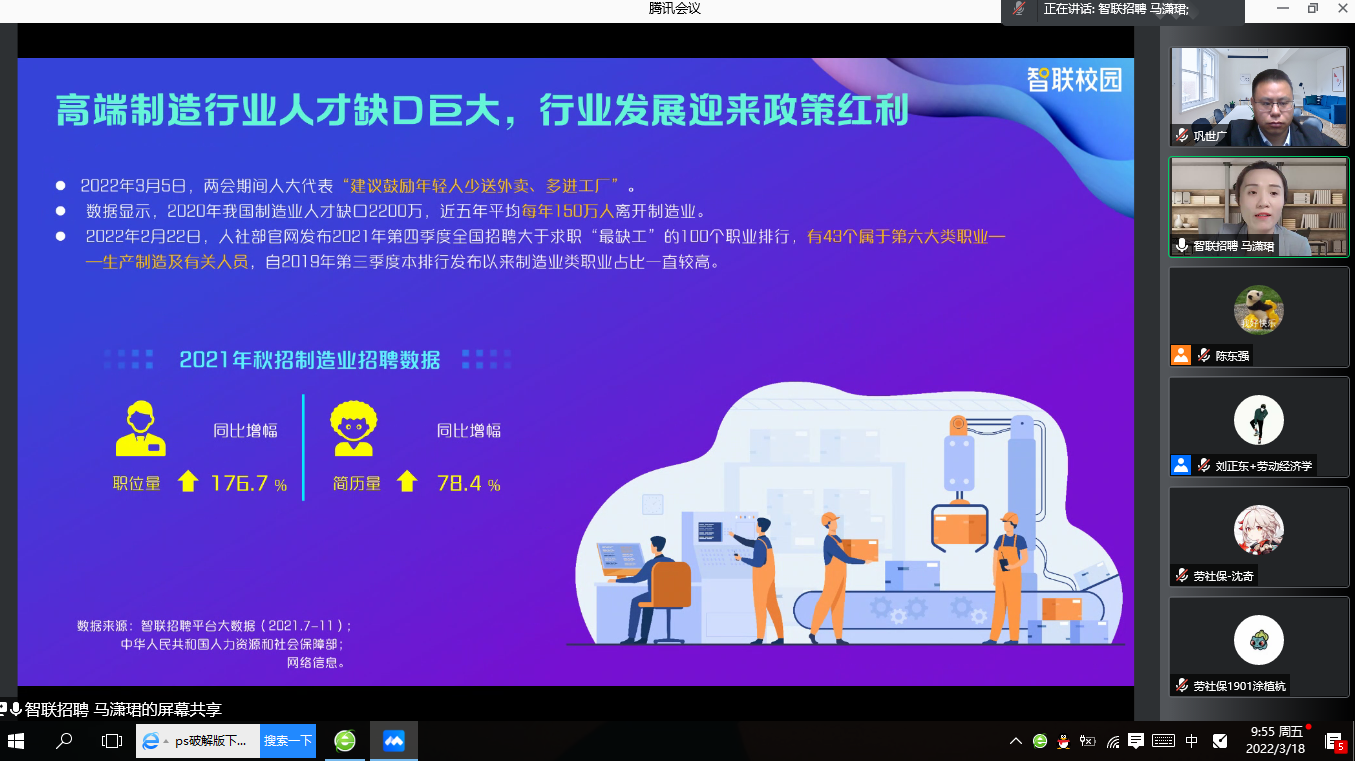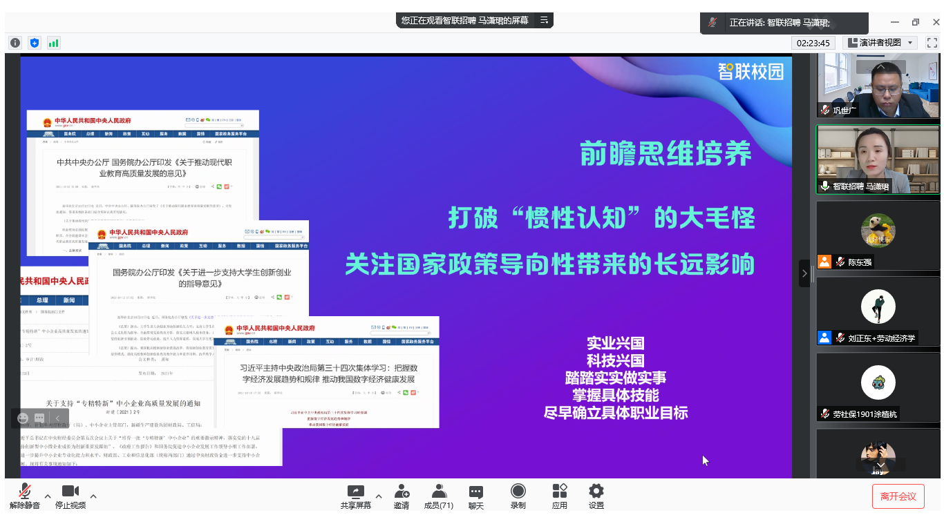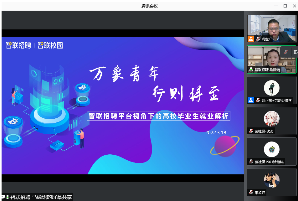 于3月18日上午通过腾讯会议线上举办了主题为“行则将至——智联招聘平台视角下的高校毕业生就业解析”的就业培训专题讲座,本次讲座由智联招聘校园及国际业务事业部执行总监马潇珺主讲,黑丝