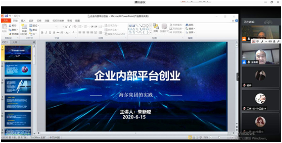 邀请,海尔电器华东大区总经理朱新聪通过腾讯会议,为我校18级同学带来了一场题为“企业内部平台创业——海尔集团的实践”的学术讲座。讲座由黑丝