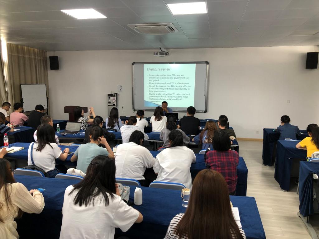 郭海副教授作了题为“Fiscal Responsibility Shifting between State and Local Governments: The Role of Tax and Expenditure Limits”的学术报告。他指出根据地方政府偏好理论和财政分权理论,由地方政府提供公共服务更加有效率。但是当绝大部分税收权上升至联邦政府和州政府时会导致地方的事权和支出责任呈现不对等的状态。郭教授基于1993-2014年政府层级面板数据,来探讨州政府和地方政府补贴TELs水平对州政府的收入和支出规模占比的影响。研究发现,州政府的TELs对州政府的支出比例、税收比例、政府间转移支付有显著的负向影响,而地方政府的TELs对州政府的支出比例有显著的负向影响,但对收入税收比例和政府间转移支付有显著的正向影响,因此TELs显著影响州政府和地区政府之间事权与支出责任关系。