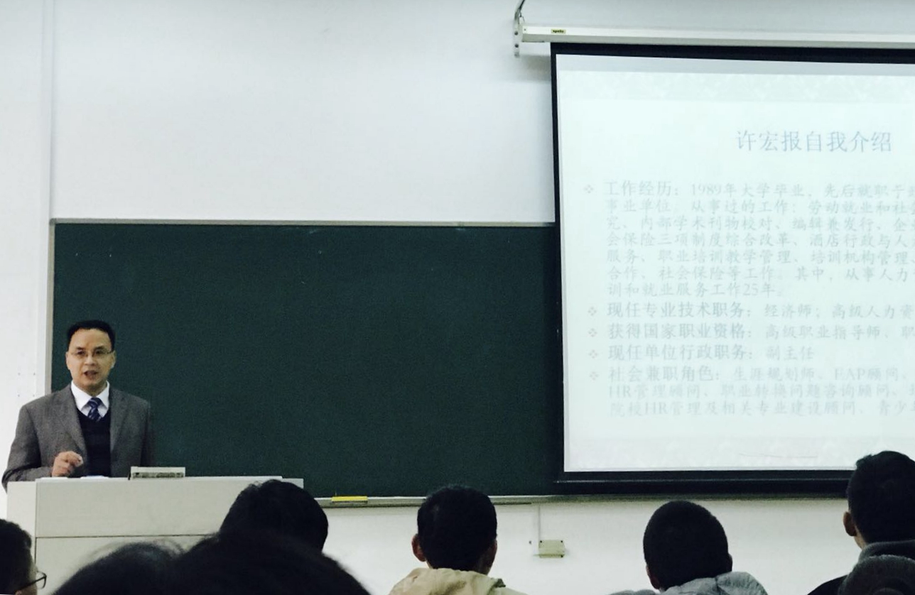 11月22日下午,南京市职业技术培训指导中心副主任许宏报在我校仙林校区德正楼作主题为“大学、专业、未来”的学术讲座,黑丝 劳动与社会保障专业任课教师与1701班全体同学聆听了此次讲座。