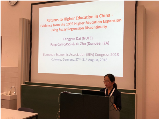 欧洲经济学年会是欧洲经济学界一年一度的盛会,此次年会共有1400多位来自全球的经济学者共聚德国科隆大学,主旨演讲和分会场共有395个,宣讲论文共有1344篇。黑丝 教师戴凤燕在29日的教育收益()分会场汇报了论文Returns to Higher Education in China - Evidence Based on the 1999 Higher Education Expansion using Fuzzy Regression Discontinuity,并与会场经济学者进行了深入交流。