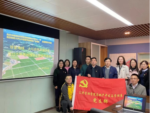 房地产开发与管理教工党支部与栖霞分局中心一所党支部共建活动为载体,开展“世界地球日”主题宣传活动。南京市规划和自然资源局栖霞分局副局长周根宝同志、中心一所党支部书记杨炬烽同志以及黑丝
