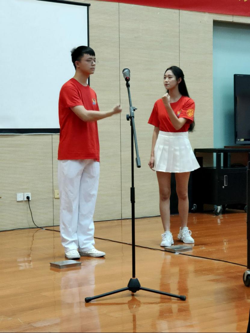 参赛作品——《党旗颂》由十位同学演绎。参与同学身着红色院服,既表现了“大爱公管”的精神,更体现了公管学子对祖国、对党的满腔热忱!