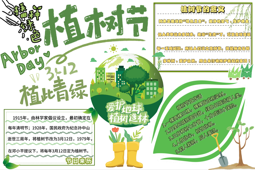 这张植树节手抄报以清新明快的绿色为主调,洋溢着蓬勃的生命力。最上方用极具创意的 “播种绿色” 手绘图案和苍劲有力的 “植树节” 艺术字吸引住大家的目光。中间部分又以地球为核心画面,城市与绿树和谐相融,“爱护地球 植树造林” 的文字直抵人心,凸显环保理念。手抄报的文字内容写了植树节的起源和意义,像我国将孙中山先生逝世的 3 月 12 日设为植树节,意在倡导人们积极投身造林护林行动,增强环保意识,守护美丽家园。右下角的树苗、铁锹图案,生动展现植树场景,同时文字部分也在号召大家亲身参与,为大地增添一抹抹新绿。